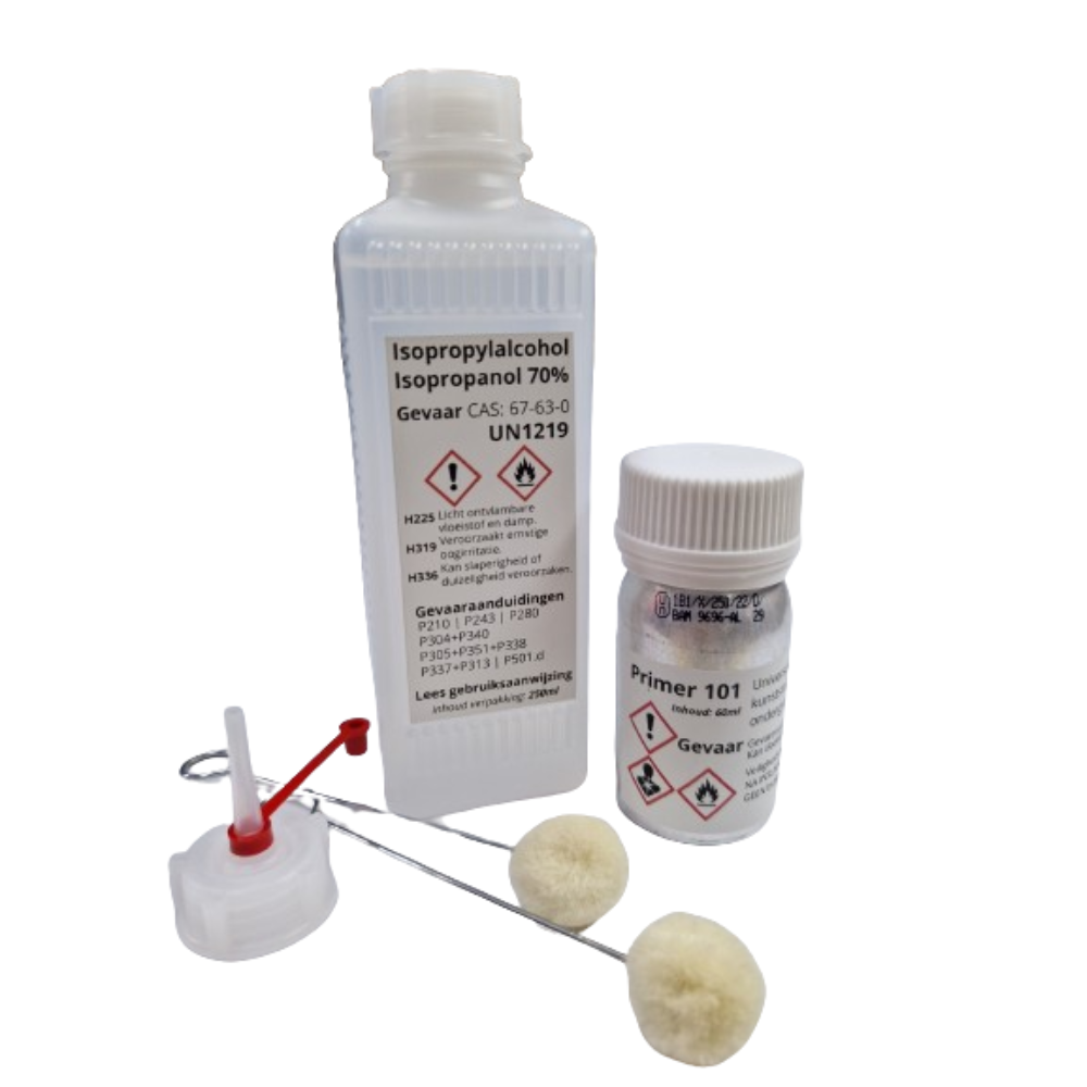 Ontdek het gemak van probleemloze montage met onze Isopropanol en Primer 101 (UV). Zonder boren, zonder schroeven – alleen optimale hechting.